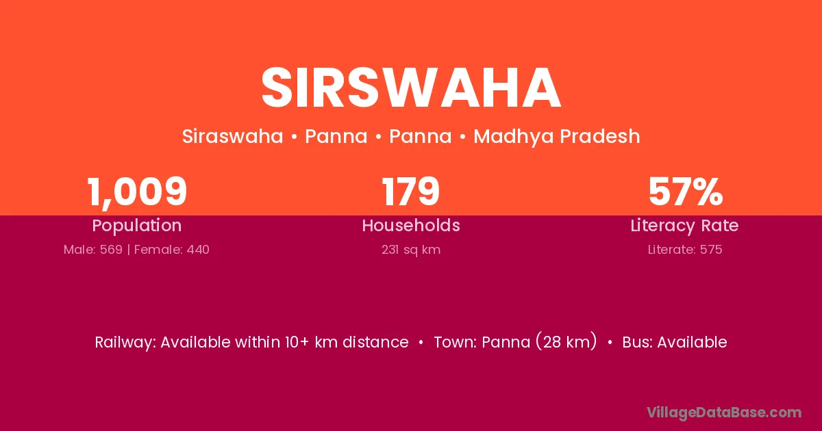 Panna (28 km) is the nearest town to Sirswaha village for major economic activities and is located approximately 28 km away.
