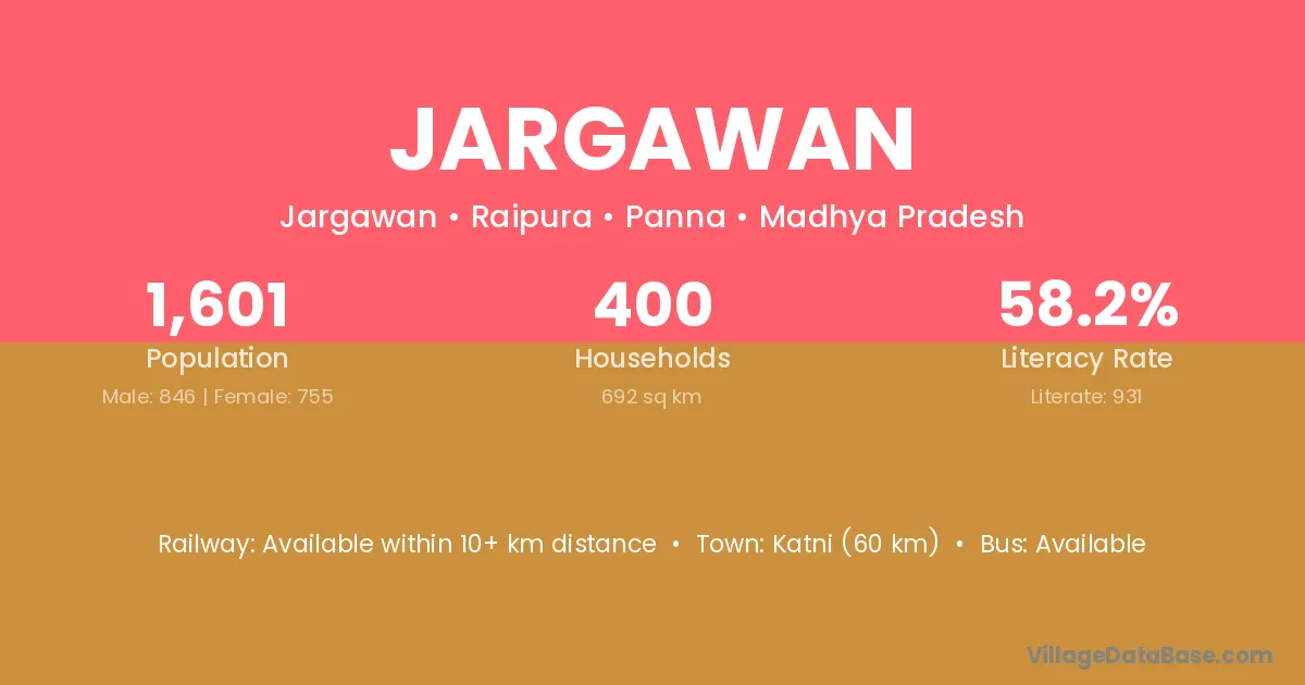 Katni (60 km) is the nearest town to Jargawan village for major economic activities and is located approximately 60 km away.