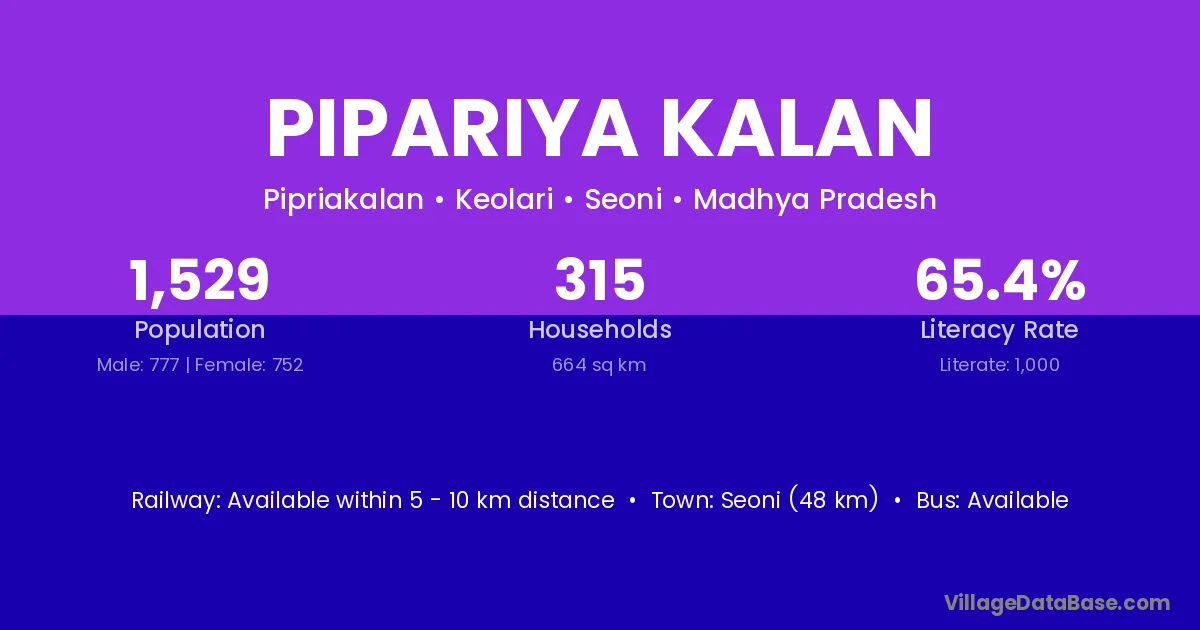 Katni (65 km) is the nearest town to Pipariya Kalan village for major economic activities and is located approximately 65 km away.