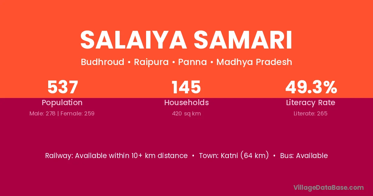 Katni (64 km) is the nearest town to Salaiya Samari village for major economic activities and is located approximately 64 km away.