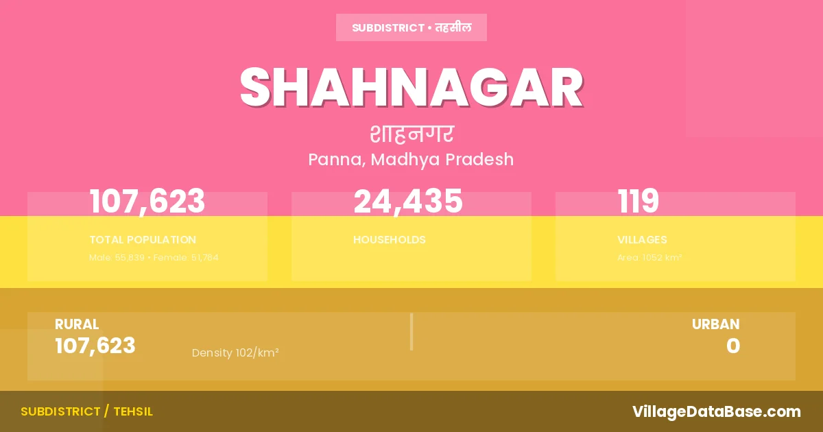According to the 2011 census The total area of Shahnagar Tehsil is 1052 km², with a population of 107623 people. The population density is 102 inhabitants per square kilometre, and there are approximately 24435 houses in the sub district.