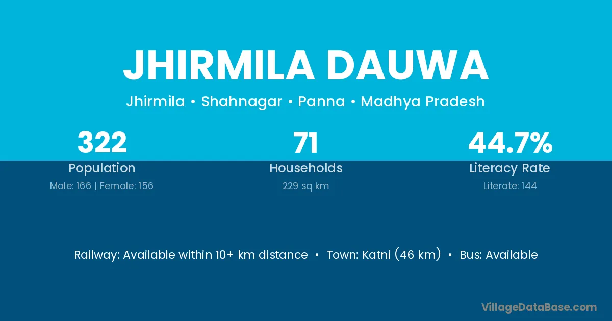 Katni (46 km) is the nearest town to Jhirmila Dauwa village for major economic activities and is located approximately 46 km away.