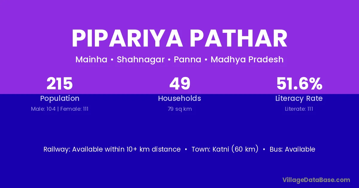 Pipariya Pathar village has a total population of 215 people, of which 104 are males and 111 are females.