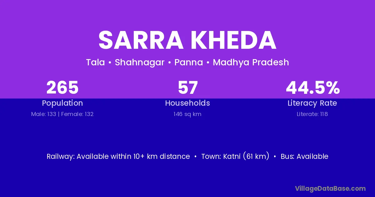 Katni (61 km) is the nearest town to Sarra Kheda village for major economic activities and is located approximately 61 km away.