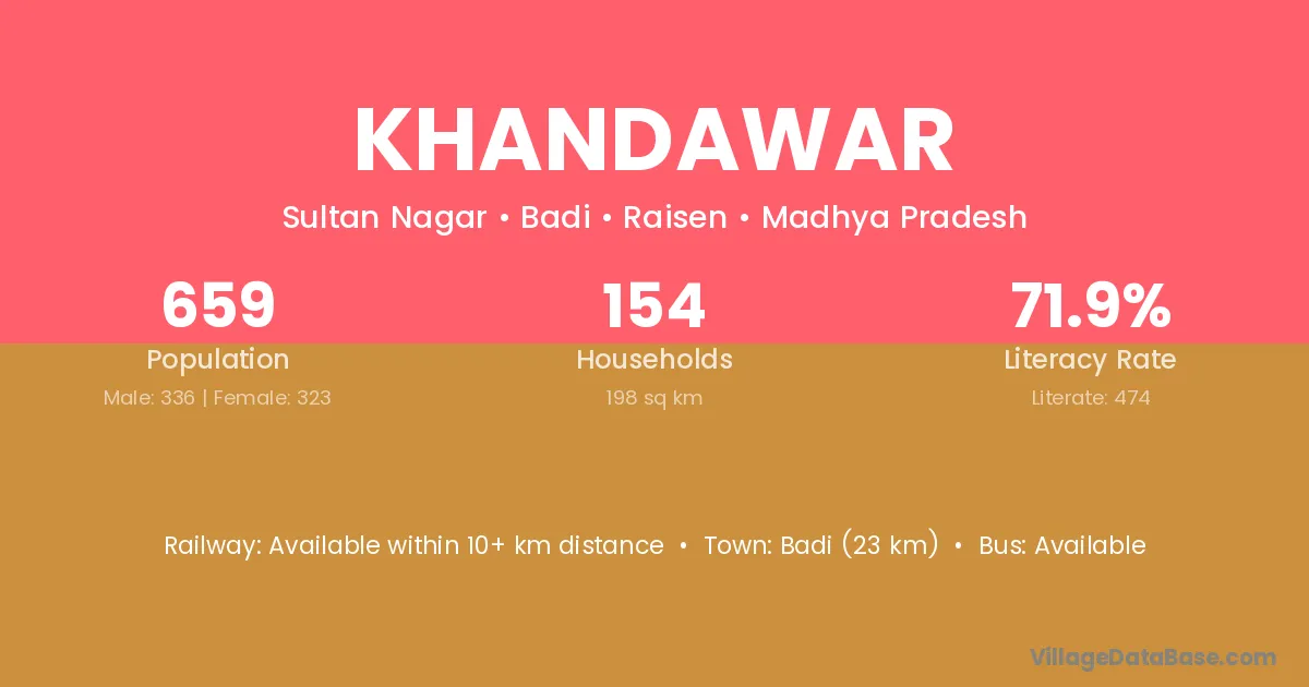 Badi (23 km) is the nearest town to Khandawar village for major economic activities and is located approximately 23 km away.