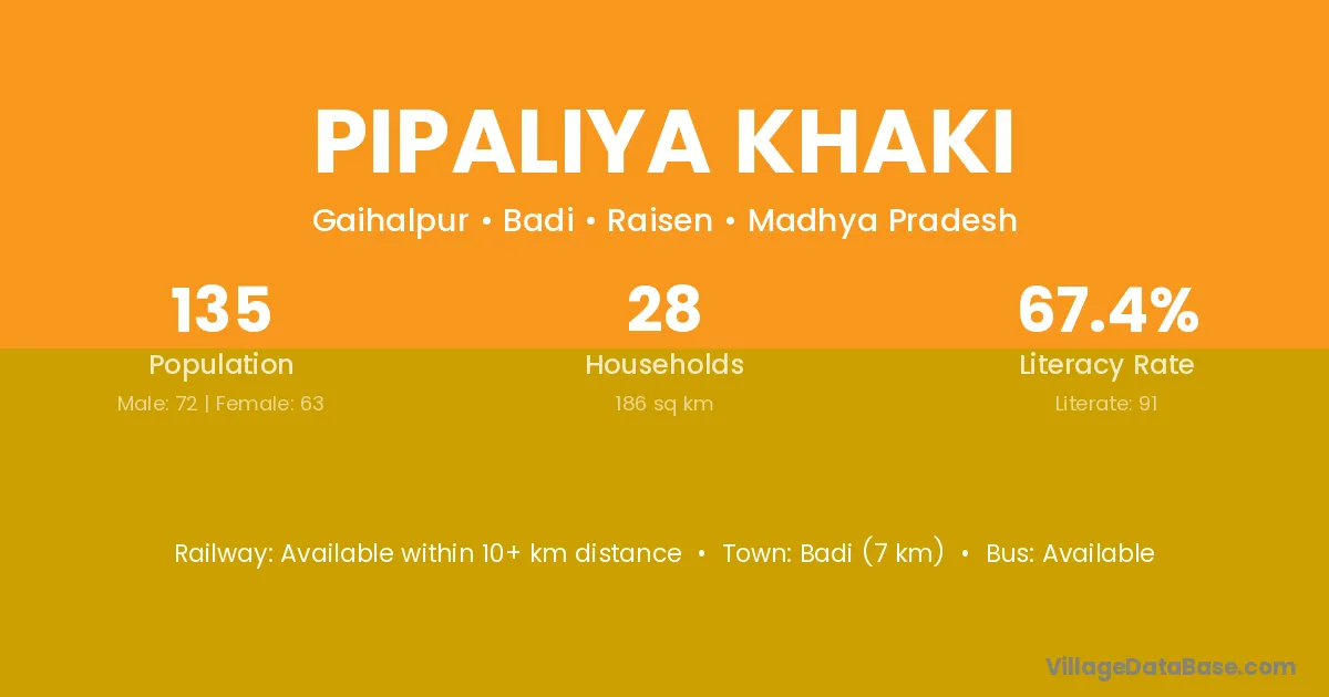 Pipaliya Khaki village has a total population of 135 people, of which 72 are males and 63 are females.