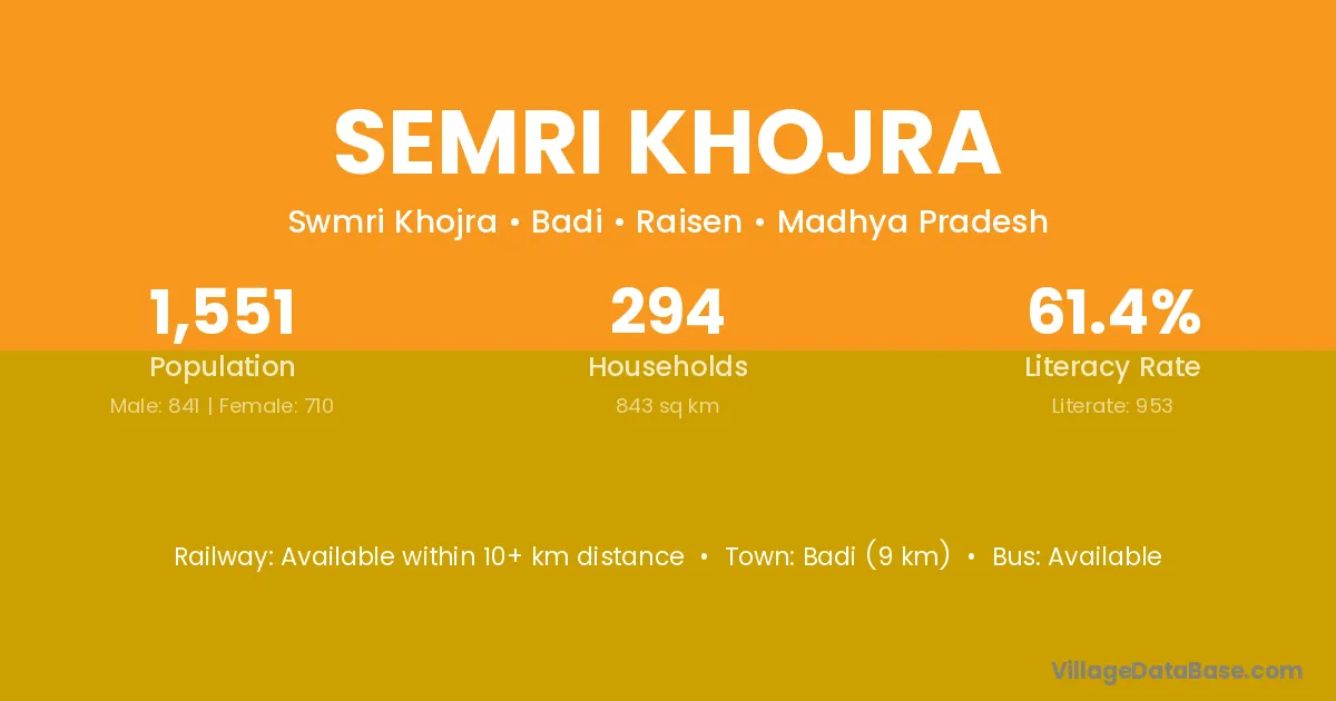 Badi (9 km) is the nearest town to Semri Khojra village for major economic activities and is located approximately 9 km away.