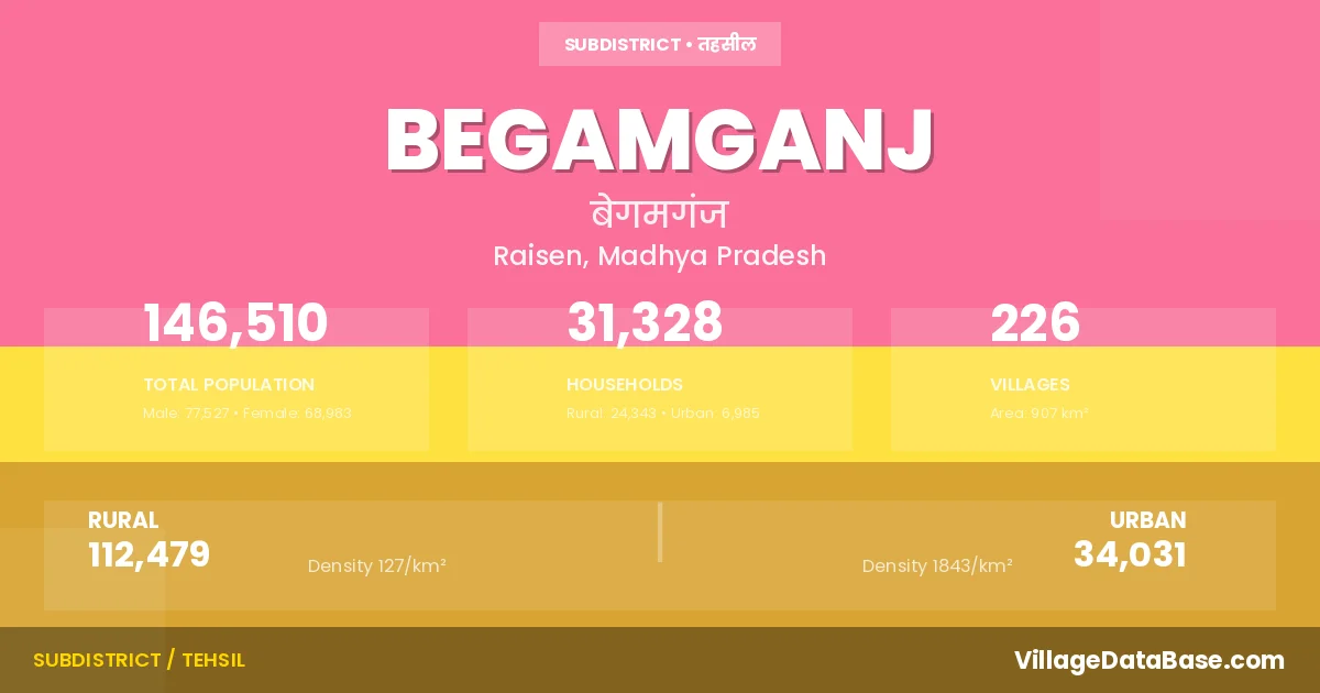 According to the 2011 census The total area of Begamganj Tehsil is 907 km², with a population of 146510 people. The population density is 162 inhabitants per square kilometre, and there are approximately 31328 houses in the sub district.