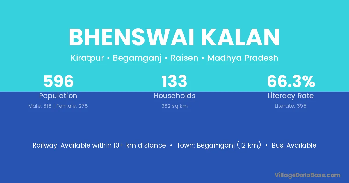 Begamganj (12 km) is the nearest town to Bhenswai Kalan village for major economic activities and is located approximately 12 km away.