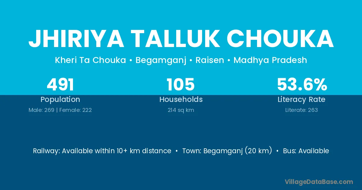 Begamganj (20 km) is the nearest town to Jhiriya Talluk Chouka village for major economic activities and is located approximately 20 km away.