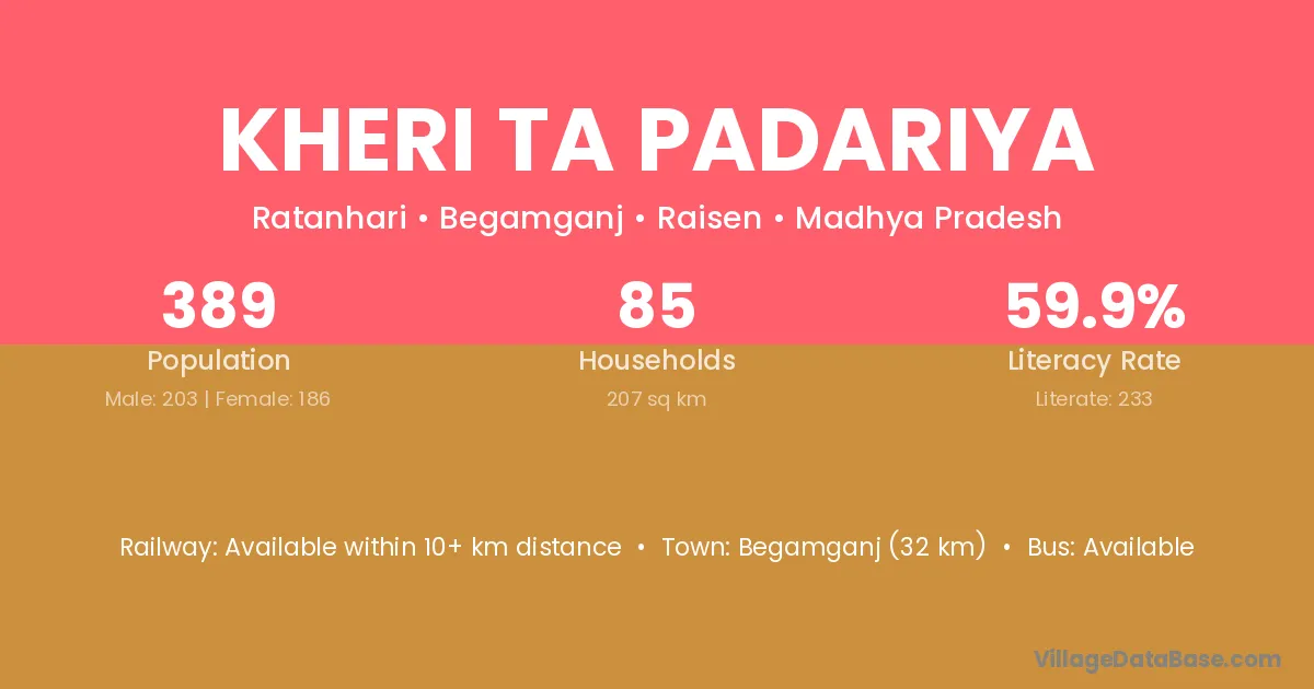 Begamganj (32 km) is the nearest town to Kheri Ta Padariya village for major economic activities and is located approximately 32 km away.