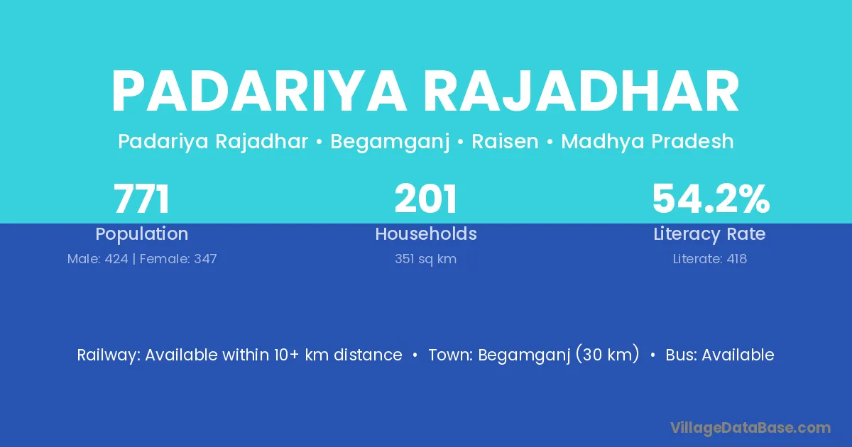 Begamganj (30 km) is the nearest town to Padariya Rajadhar village for major economic activities and is located approximately 30 km away.