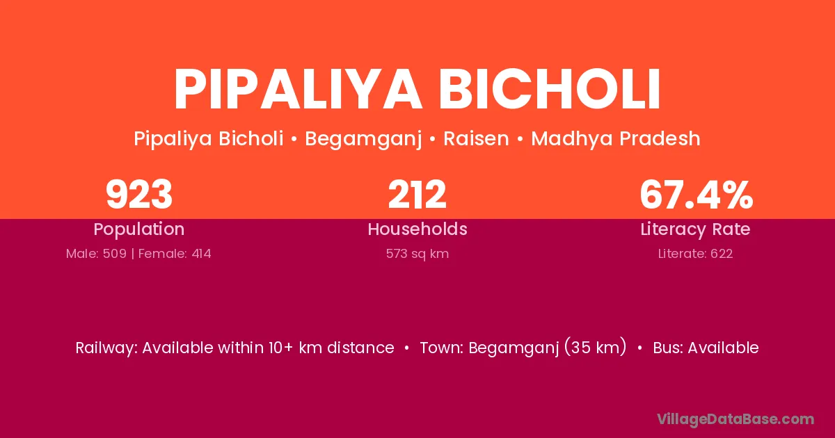 Begamganj (35 km) is the nearest town to Pipaliya Bicholi village for major economic activities and is located approximately 35 km away.