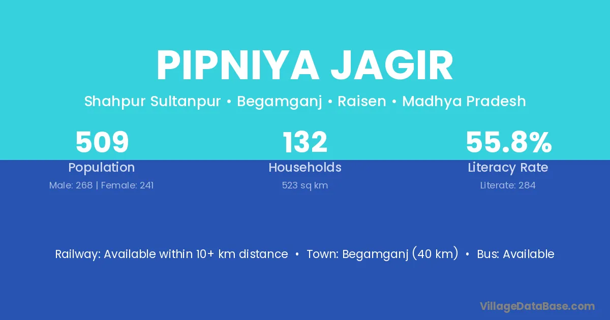 Begamganj (40 km) is the nearest town to Pipniya Jagir village for major economic activities and is located approximately 40 km away.
