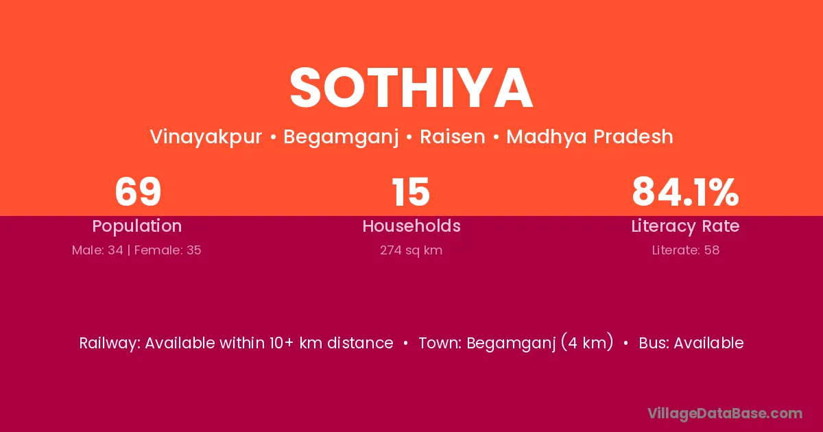 Sothiya village has a total population of 69 people, of which 34 are males and 35 are females.