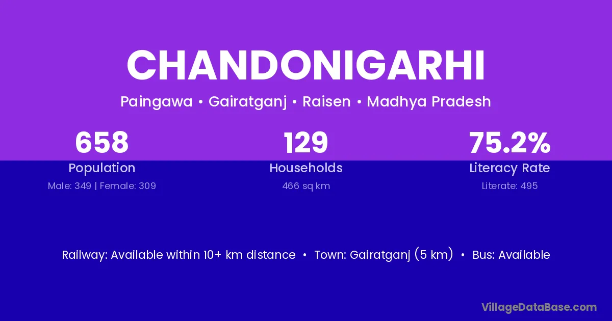 Chandonigarhi village has a total population of 658 people, of which 349 are males and 309 are females.