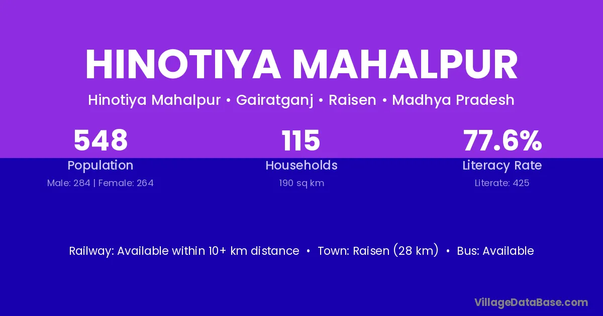 Raisen (28 km) is the nearest town to Hinotiya Mahalpur village for major economic activities and is located approximately 28 km away.