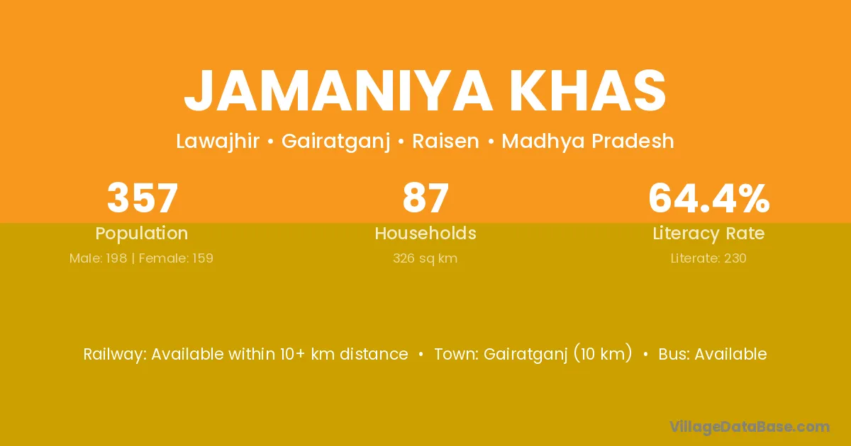 Jamaniya Khas village has a total population of 357 people, of which 198 are males and 159 are females.