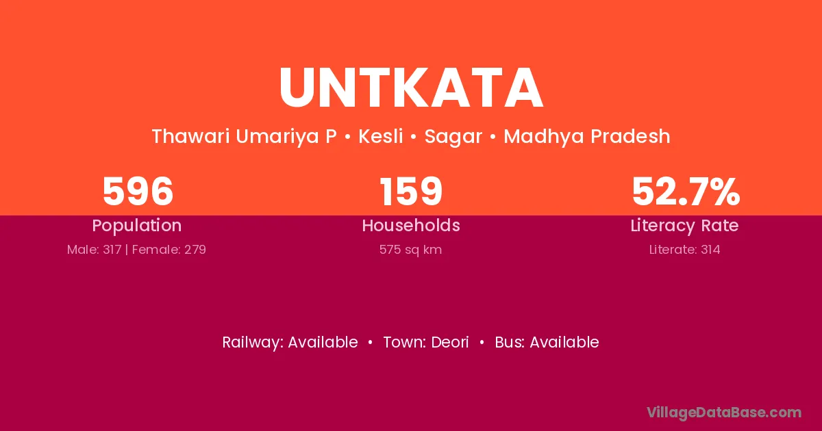 The literacy rate of Untkata village is 54.63%. Male literacy stands at 65.00% and female literacy at 43.79%.