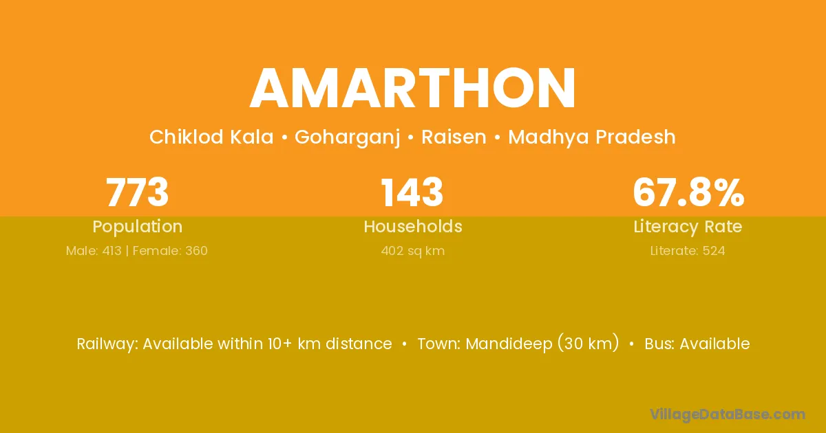 Mandideep (30 km) is the nearest town to Amarthon village for major economic activities and is located approximately 30 km away.