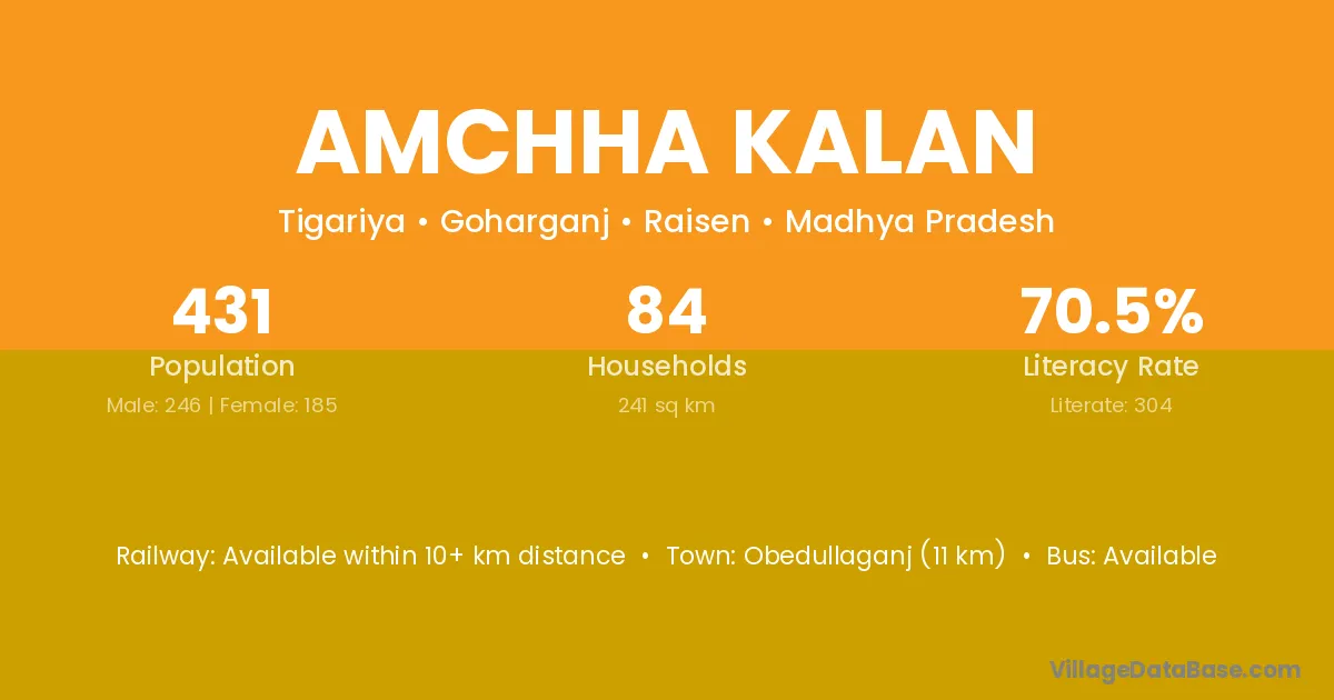 Obedullaganj (11 km) is the nearest town to Amchha Kalan village for major economic activities and is located approximately 11 km away.