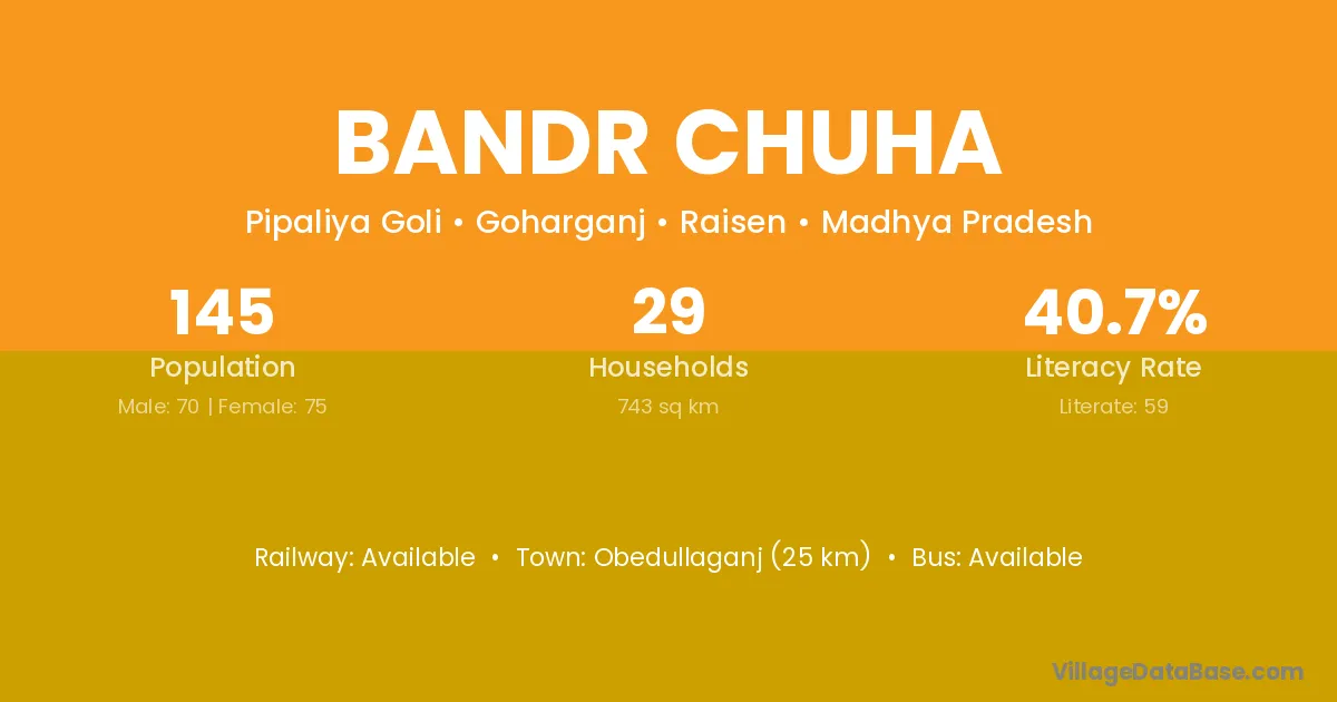 Obedullaganj (25 km) is the nearest town to Bandr Chuha village for major economic activities and is located approximately 25 km away.