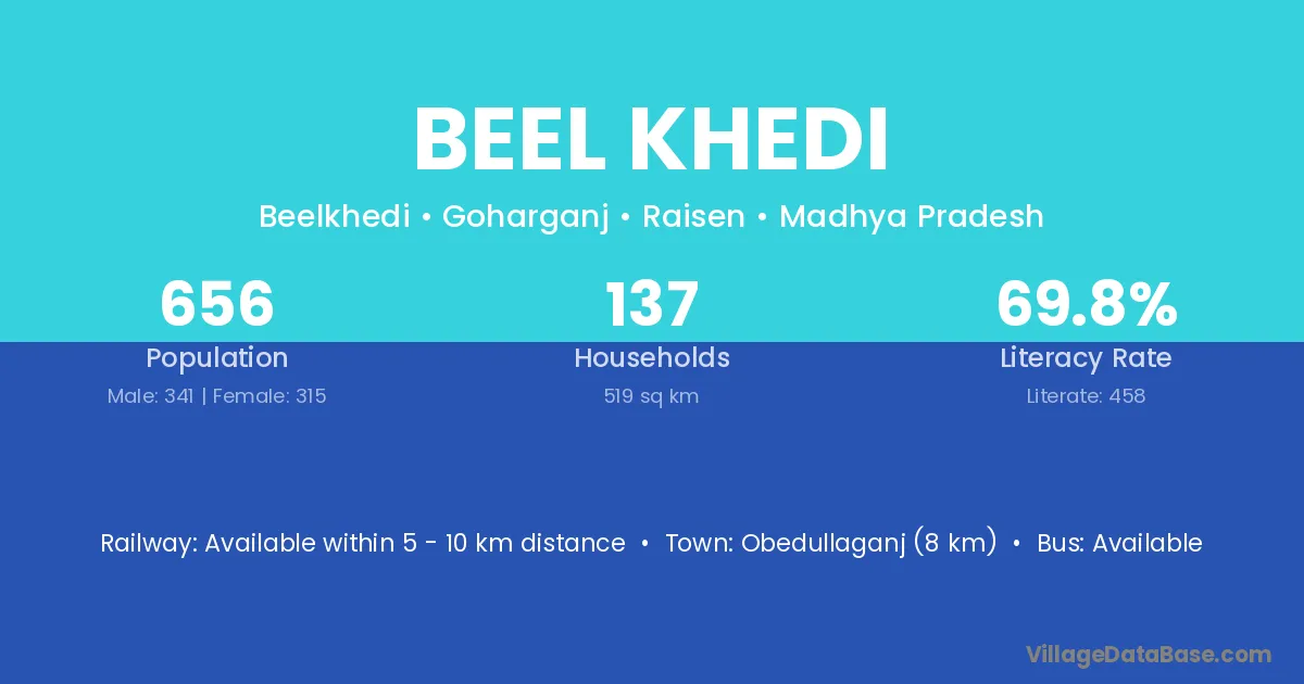 Obedullaganj (8 km) is the nearest town to Beel Khedi village for major economic activities and is located approximately 8 km away.