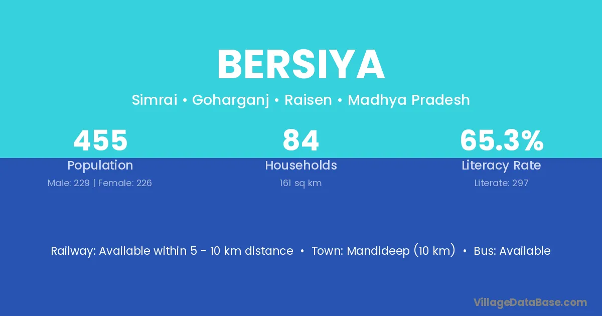 Mandideep (10 km) is the nearest town to Bersiya village for major economic activities and is located approximately 10 km away.