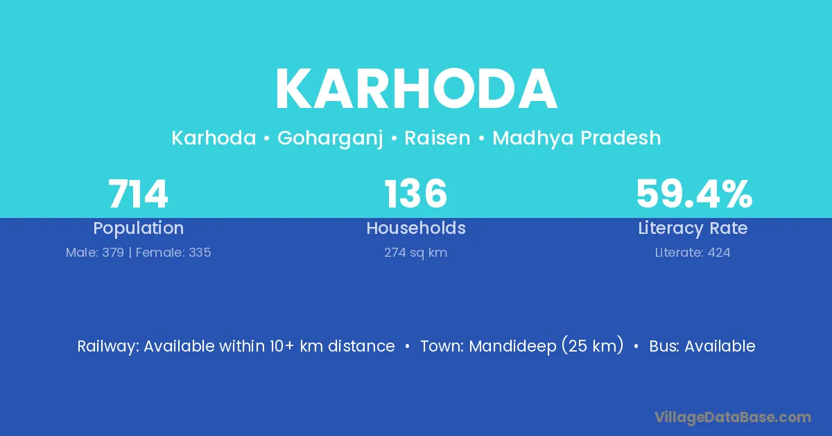 Mandideep (25 km) is the nearest town to Karhoda village for major economic activities and is located approximately 25 km away.