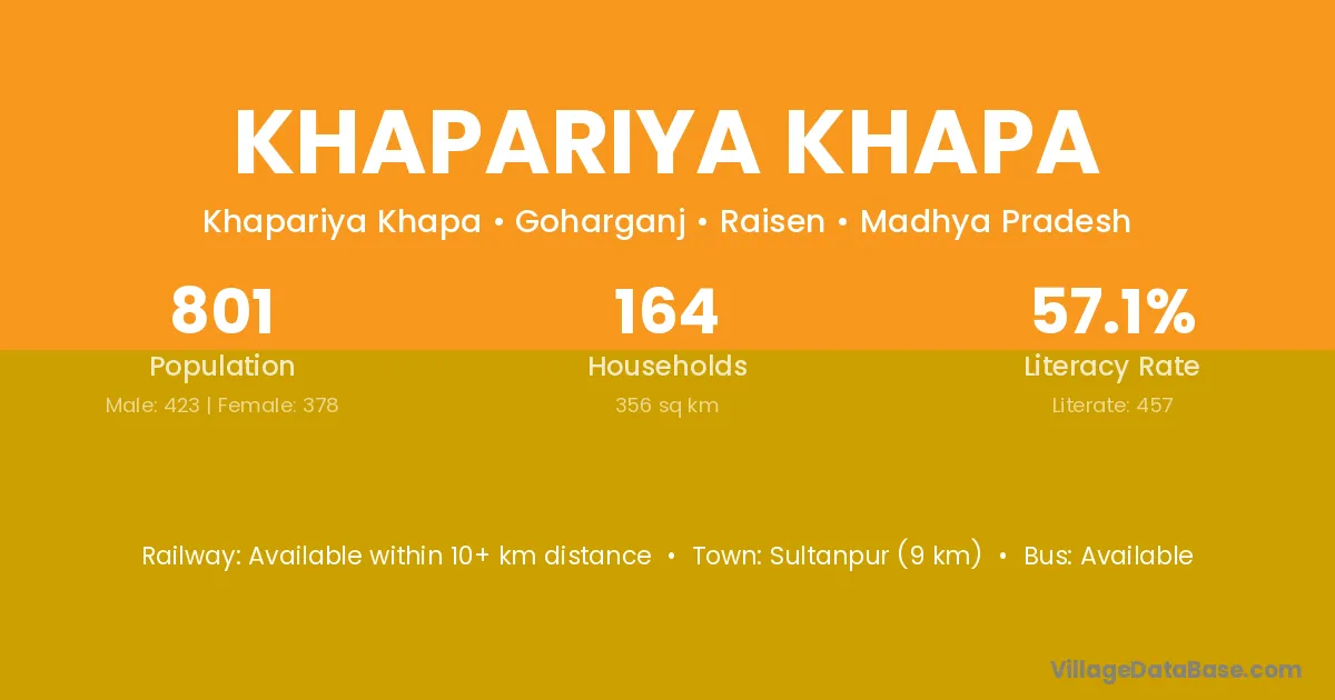 Khapariya Khapa village has a total population of 801 people, of which 423 are males and 378 are females.