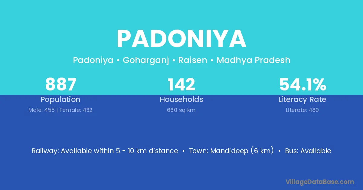 Mandideep (6 km) is the nearest town to Padoniya village for major economic activities and is located approximately 6 km away.