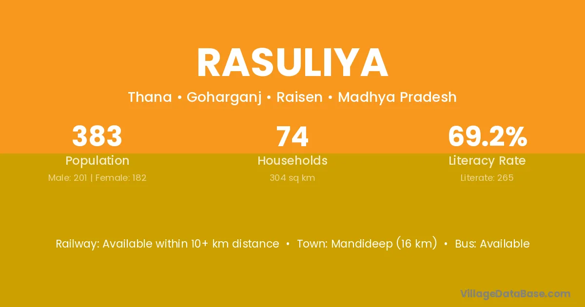 Mandideep (16 km) is the nearest town to Rasuliya village for major economic activities and is located approximately 16 km away.