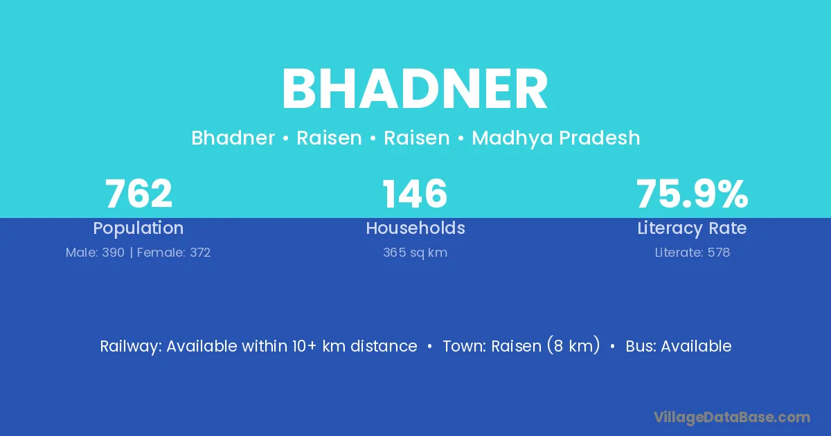 Raisen (8 km) is the nearest town to Bhadner village for major economic activities and is located approximately 8 km away.