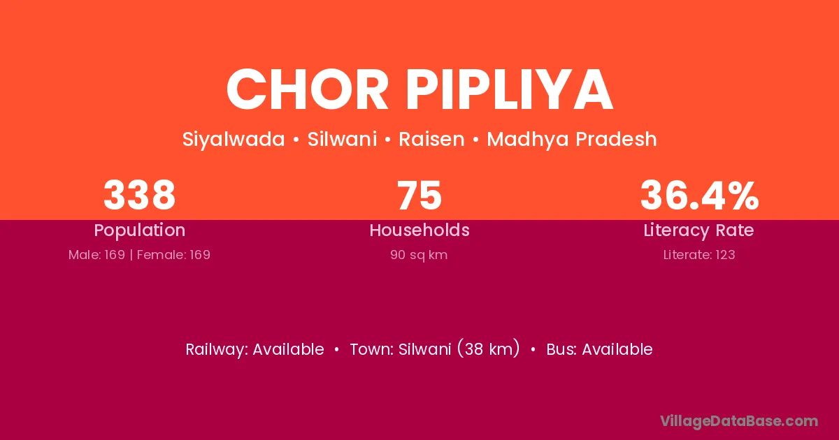 Silwani (38 km) is the nearest town to Chor Pipliya village for major economic activities and is located approximately 38 km away.