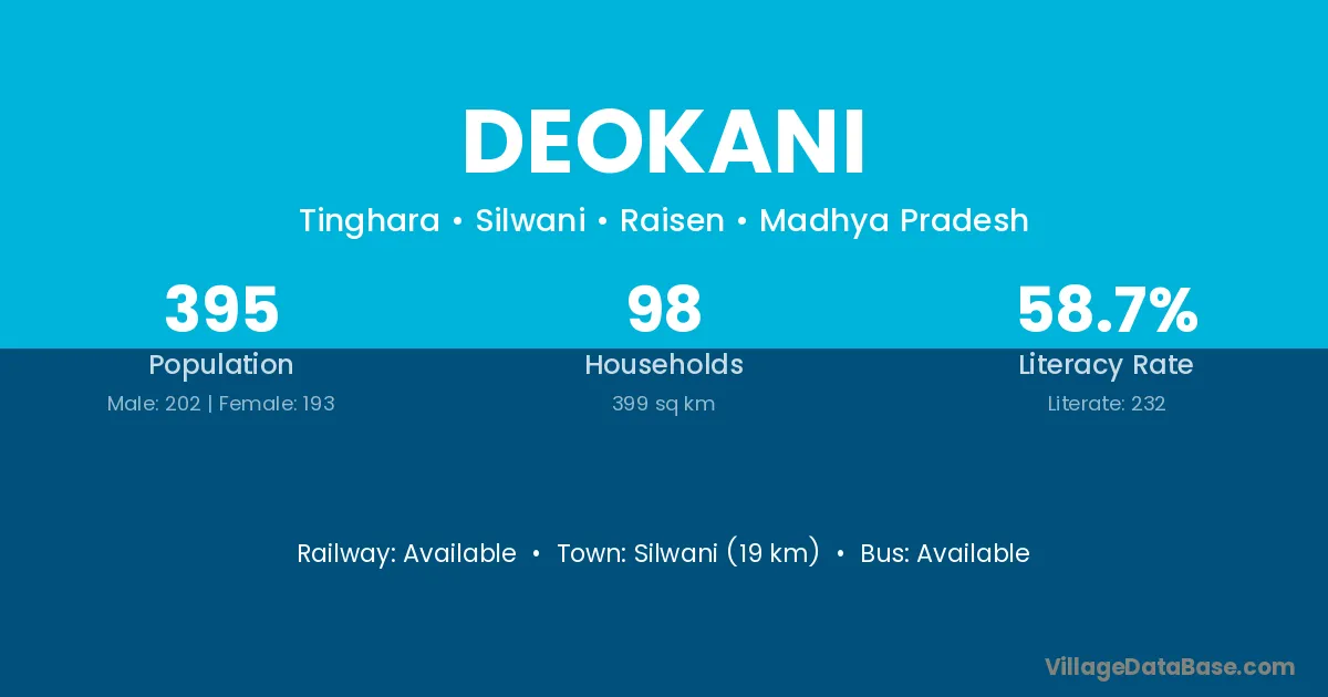 Silwani (19 km) is the nearest town to Deokani village for major economic activities and is located approximately 19 km away.