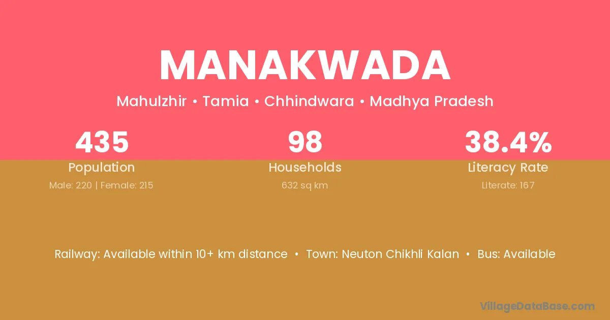 Silwani (21 km) is the nearest town to Manakwada village for major economic activities and is located approximately 21 km away.