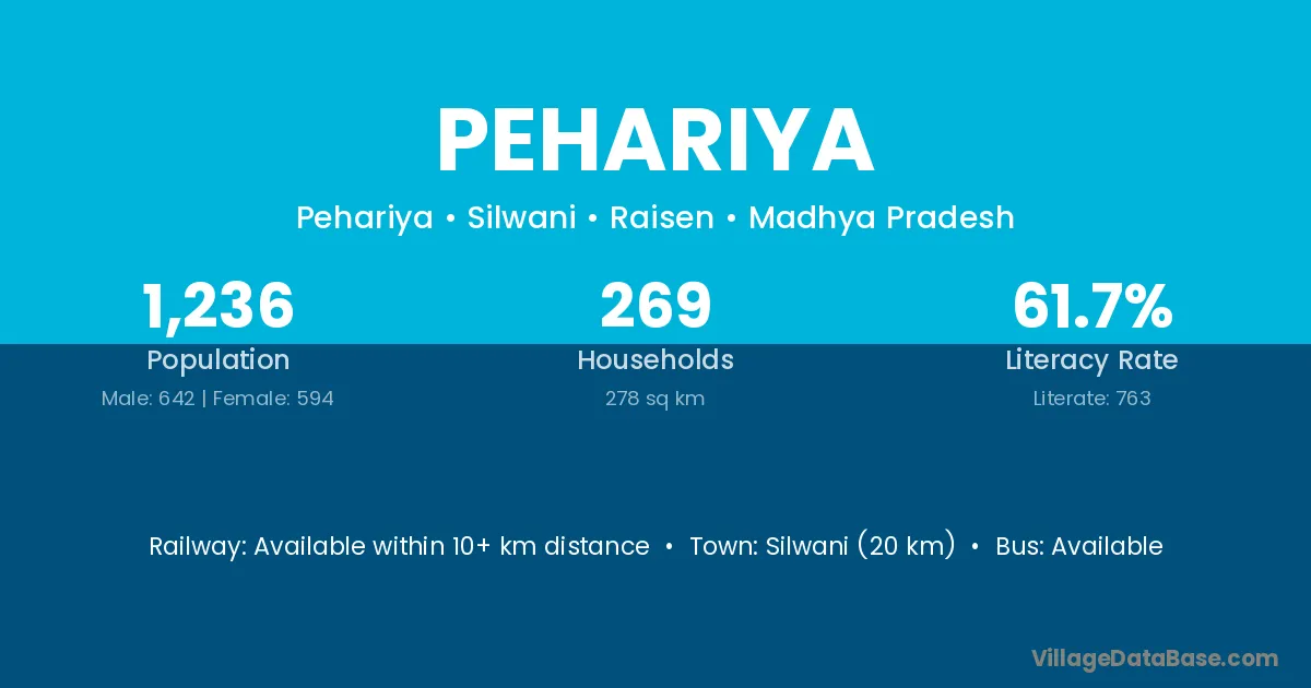 Silwani (20 km) is the nearest town to Pehariya village for major economic activities and is located approximately 20 km away.