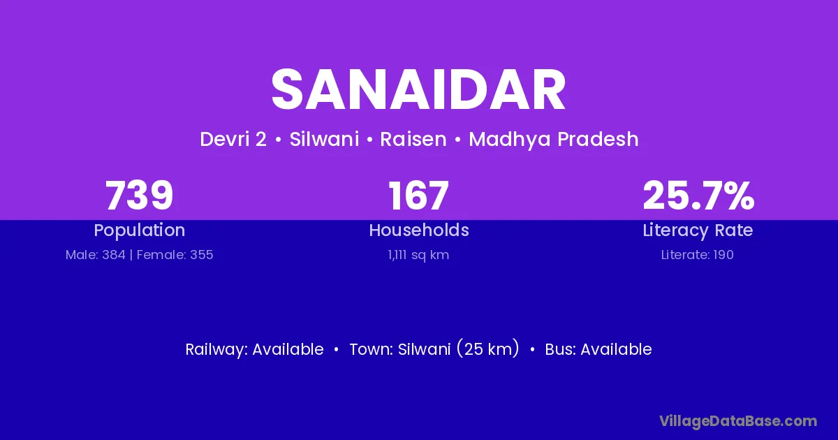 Silwani (25 km) is the nearest town to Sanaidar village for major economic activities and is located approximately 25 km away.