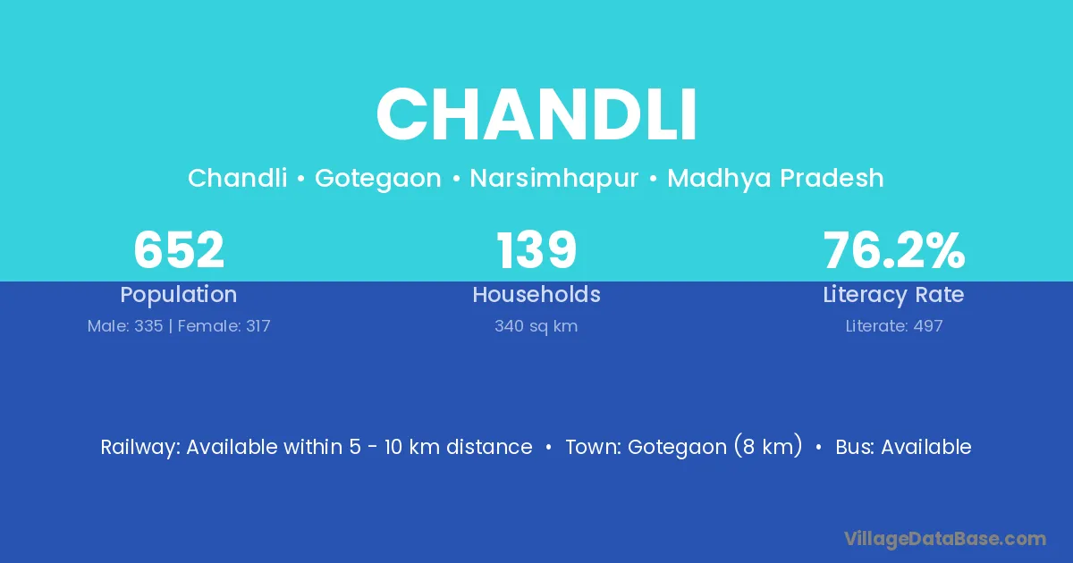 The literacy rate of Chandli village is 65.25%. Male literacy stands at 75.83% and female literacy at 52.78%.