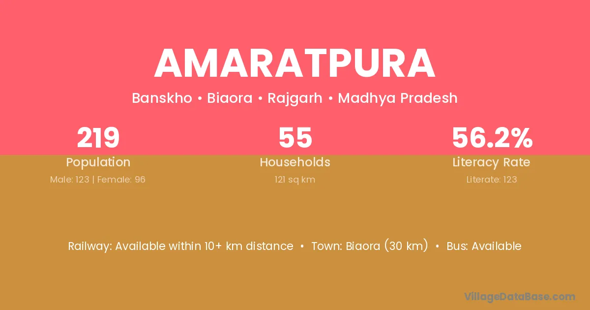 Biaora (30 km) is the nearest town to Amaratpura village for major economic activities and is located approximately 30 km away.