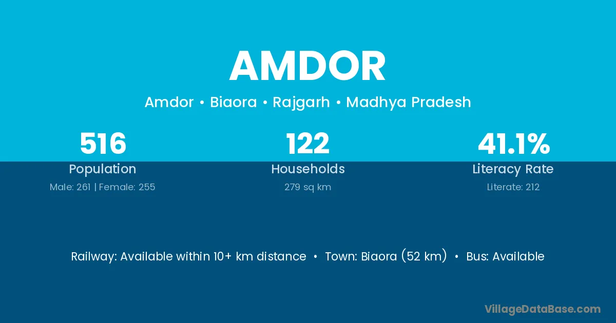Biaora (52 km) is the nearest town to Amdor village for major economic activities and is located approximately 52 km away.