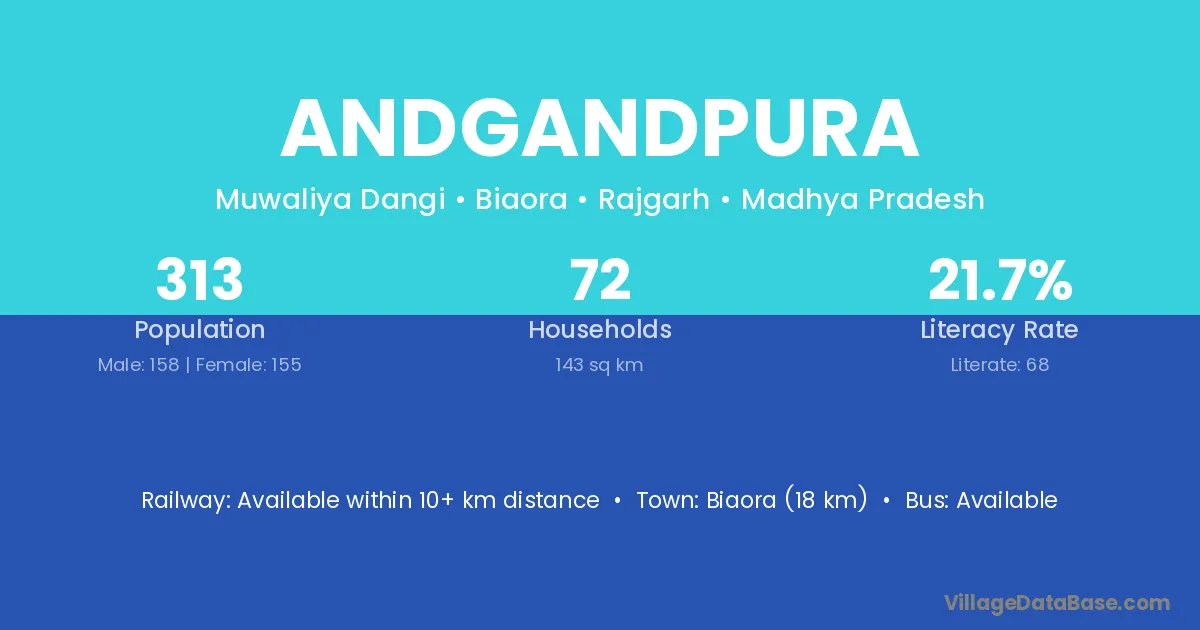 Biaora (18 km) is the nearest town to Andgandpura village for major economic activities and is located approximately 18 km away.