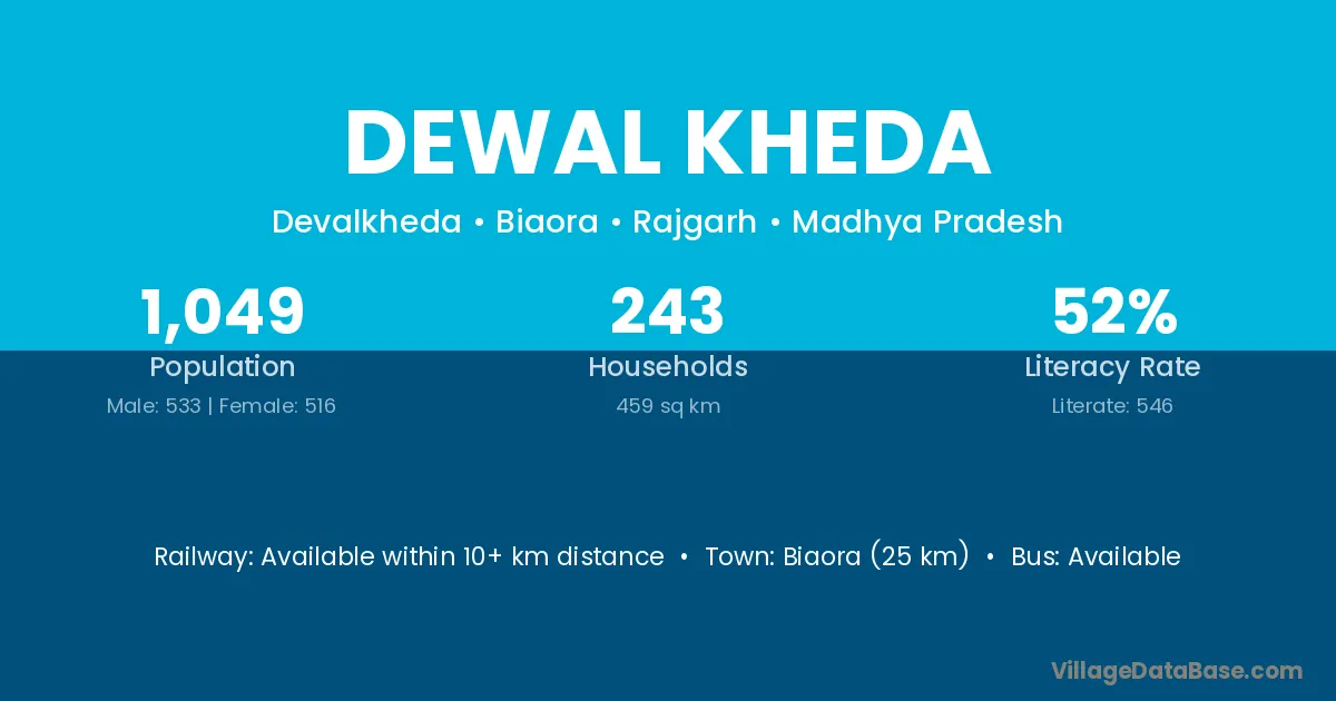 Dewal Kheda village has a total population of 1,049 people, of which 533 are males and 516 are females.