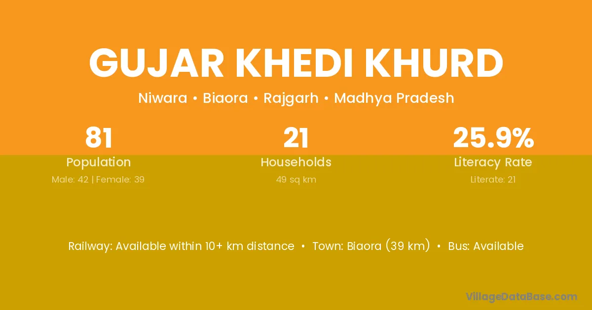 Gujar Khedi Khurd village has a total population of 81 people, of which 42 are males and 39 are females.