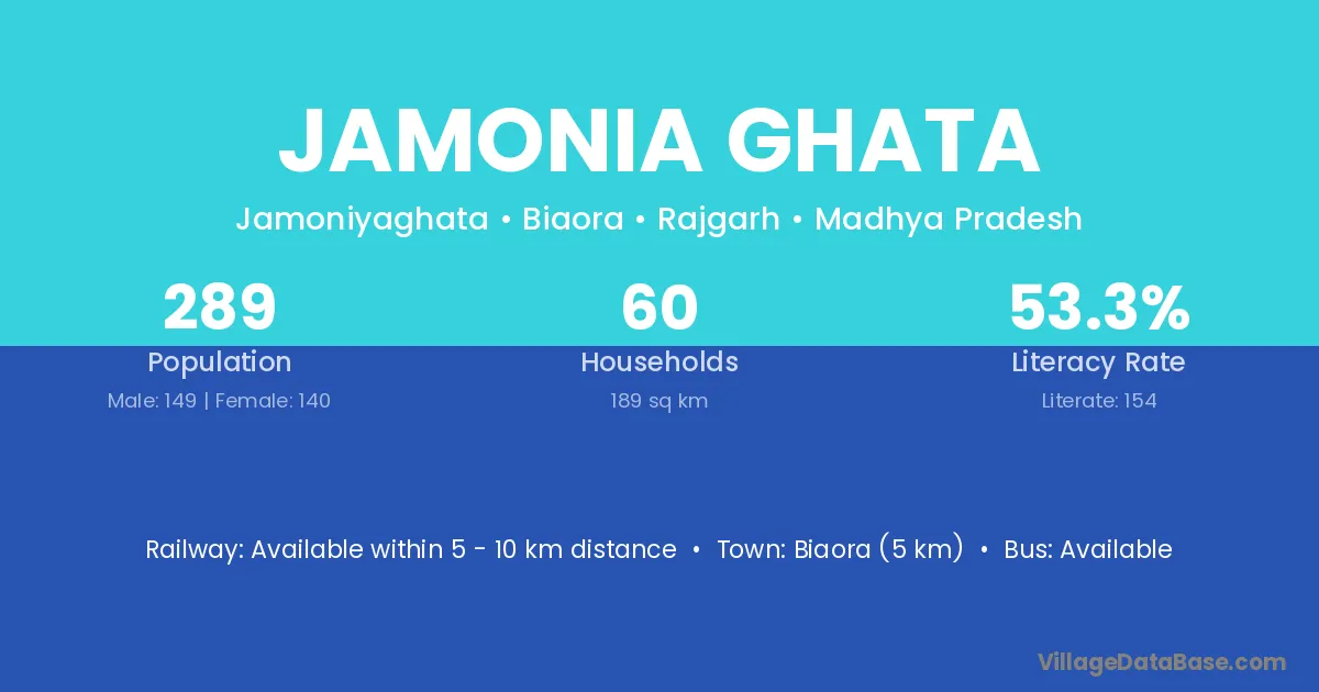 Biaora (5 km) is the nearest town to Jamonia Ghata village for major economic activities and is located approximately 5 km away.