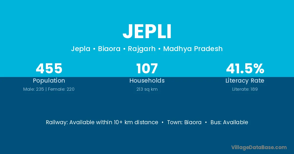 The literacy rate of Jepli village is 41.54%. Male literacy stands at 51.06% and female literacy at 31.36%.