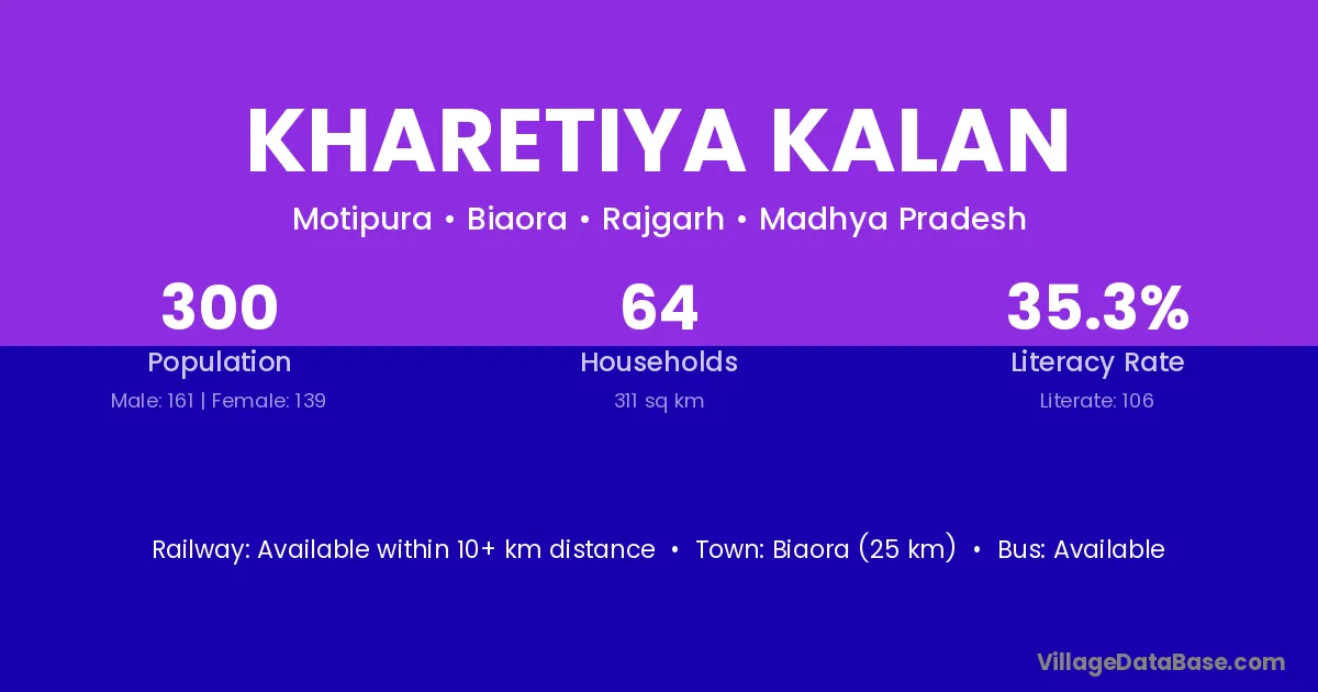 Biaora (25 km) is the nearest town to Kharetiya Kalan village for major economic activities and is located approximately 25 km away.
