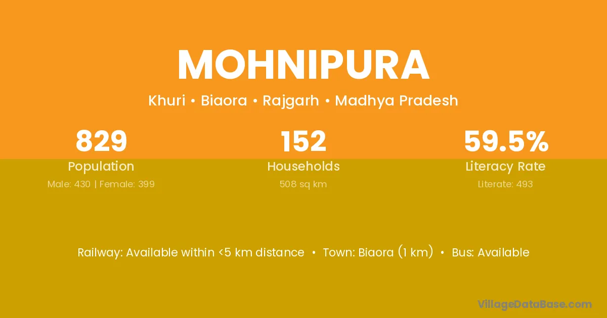 Biaora (1 km) is the nearest town to Mohnipura village for major economic activities and is located approximately 1 km away.
