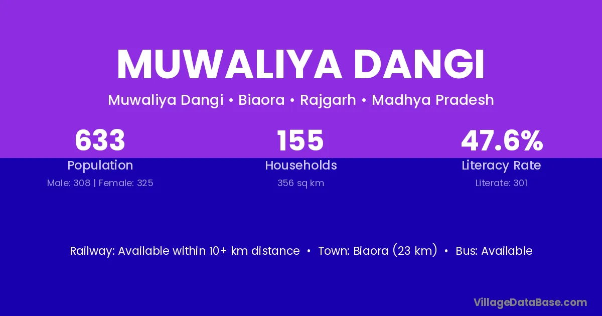 Biaora (23 km) is the nearest town to Muwaliya Dangi village for major economic activities and is located approximately 23 km away.