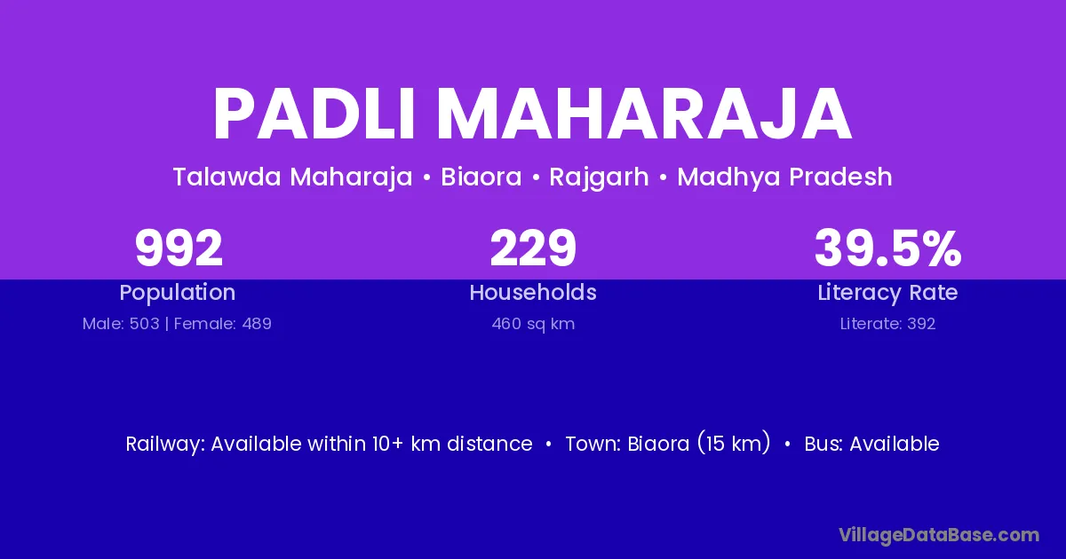 Biaora (15 km) is the nearest town to Padli Maharaja village for major economic activities and is located approximately 15 km away.